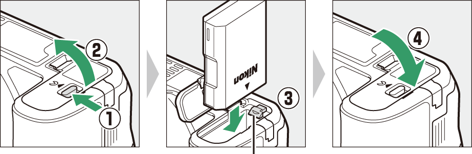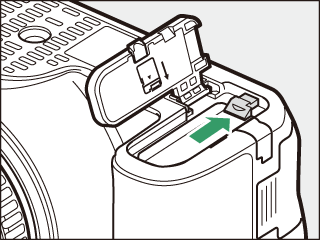 For at fjerne batteriet skal du slukke kameraet og åbne batterikammerdækslet. Tryk batterilåsen i retningen vist af pilen for at frigøre batteriet, og fjern det derefter med fingrene.
