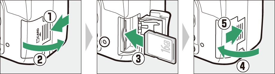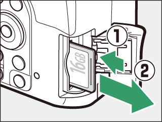 Når du har bekræftet, at hukommelseskortlampen ikke lyser mere, skal du slukke kameraet, åbne dækslet til hukommelseskortet og trykke kortet ind for at få det ud (q). Derefter kan kortet tages ud med fingrene (w).