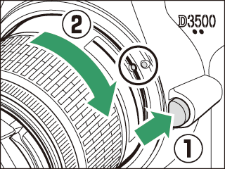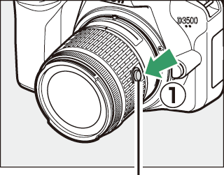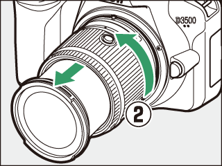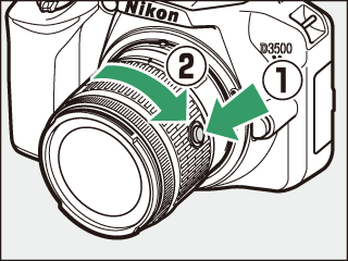 Kameraet skal være slukket ved fjernelse eller udskiftning af objektiver. Objektivet afmonteres ved at trykke på objektivudløserknappen (q) og holde den nede, mens objektivet drejes med uret (w). Når du har fjernet objektivet, skal du sætte objektivdæksel og kamerahusdæksel på igen.