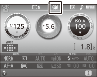 Du kan aktivere vibrationsreduktion (VR) ved at vælge Til for Optisk VR i optagemenuen (0 Optisk VR), hvis objektivet understøtter denne indstilling, eller ved at skubbe objektivets kontakt for vibrationsreduktion (VR) over på ON (TIL), hvis objektivet har en kontakt til vibrationsreduktion (VR). Der vises en indikator for vibrationsreduktion (VR) i informationsvisningen, når vibrationsreduktion (VR) er aktiveret.