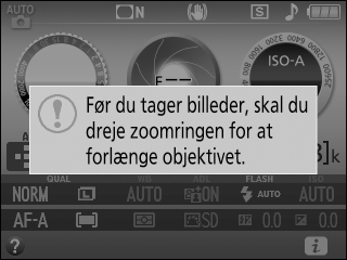 Der kan ikke tages billeder, når objektivet er sammentrukket; hvis der vises en fejlmeddelelse, fordi kameraet er blevet tændt med objektivet trukket sammen, skal du dreje zoomringen, til meddelelsen ikke længere vises.