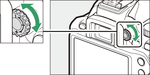 Når du har fjernet objektivdækslet, skal du dreje dioptrijusteringen, indtil fokuspunkterne er i skarpt fokus. Når du anvender dioptrijusteringen med øjet mod søgeren, skal du passe på ikke at få en finger eller en fingernegl i øjet.