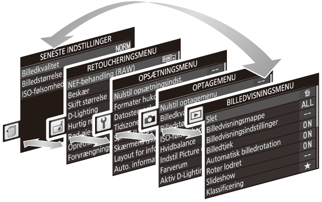 Du kan få adgang til de fleste optage-, billedvisnings- og opsætningsindstillinger via kameraets menuer. Tryk på knappen G for at få vist menuerne.
