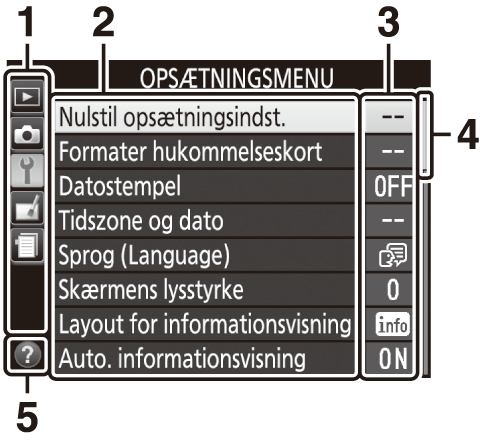 | 2 | Menuindstillinger Indstillinger i den aktuelle menu. |