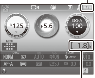 Tryk på knappen R, og kontrollér batteriniveauet og antal resterende billeder i informationsvisningen.