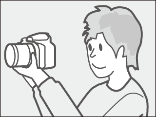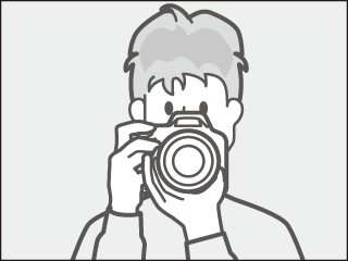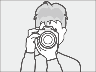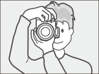 Klargør kameraet. Søgerfotografering: Når du komponerer billeder i søgeren, skal du holde grebet i højre hånd og holde kamerahuset eller objektivet med venstre hånd. Hold albuerne ind langs med kroppen.   Live View: Når du komponerer billeder på skærmen, skal du holde grebet i højre hånd og holde objektivet med venstre hånd.   Komposition af billeder i højt (portræt) format Når du komponerer billeder i højt (portræt) format, skal du holde kameraet som vist nedenfor.  Komposition af billeder i søgeren  Komposition af billeder på skærmen