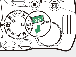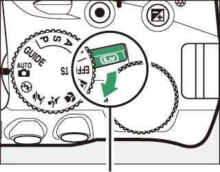 Drej programhjulet hen på i eller j. Programhjul  Billeder kan komponeres i søgeren eller på skærmen (Live View). For at starte Live View skal du dreje på Live View-vælgeren.  Live View-vælger  Komposition af billeder i søgeren  Komposition af billeder på skærmen (Live View)