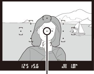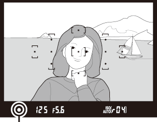 Komponér billedet. Søgerfotografering: Komponér et billede i søgeren med hovedmotivet i mindst ét af de 11 fokuspunkter.  Fokuspunkt Live View: Ved standardindstillingerne registrerer kameraet automatisk ansigter og vælger fokuspunktet. Hvis der ikke er registreret et ansigt, fokuserer kameraet på motiver tæt på midten af billedet.  Fokuspunkt Brug af zoomobjektiv Før du fokuserer, skal du dreje zoomringen for at justere brændvidden og komponere billedet. Anvend zoomringen til at zoome ind på motiver, så de udfylder et større område af billedet, eller zoom ud for at forøge det synlige område på det endelige billede (vælg længere brændvidder på objektivets brændviddeskala for at zoome ind eller kortere brændvidder for at zoome ud). Zoome ind Zoome ud  Zoomring