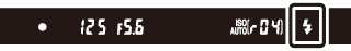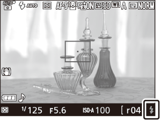 Hvis ekstra belysning er nødvendig for korrekt eksponering i indstillingen i, popper den indbyggede flash automatisk op, når udløserknappen trykkes halvt ned (0 Automatiske pop op-indstillinger). Hvis flashen er hævet, kan der udelukkende tages billeder, når flashindikatoren (M) vises. Hvis flashindikatoren ikke vises, oplader flashen; flyt kortvarigt din finger fra udløserknappen, og prøv igen.
