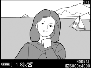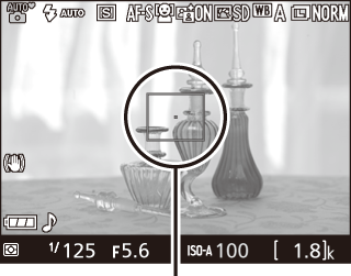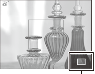 Tryk på knappen X for at forstørre visningen på skærmen op til et maksimum på omtrent 8,3 ×. Der vises et navigationsvindue i en grå ramme i visningens nederste højre hjørne. Anvend multivælgeren til at rulle til de områder af billedet, der ikke kan ses på skærmen, eller tryk på W (Q) for at zoome ud. Tryk på J for at afslutte zoom.