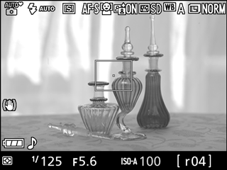 Søgervisningen slukkes automatisk, hvis der ikke foretages nogen handlinger i omtrent otte sekunder, for at spare batteri. Tryk udløserknappen halvt ned for at aktivere visningen igen. Tidsrummet, før standbytimeren automatisk udløber, kan vælges ved hjælp af indstillingen Timere for autoslukning i opsætningsmenuen (0 Timere for autoslukning).