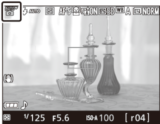 Hvis Live View er valgt i indstillingen i eller j, analyserer kameraet automatisk motivet og vælger en passende optageindstilling, når udløserknappen trykkes halvt ned for at fokusere ved hjælp af autofokus. Den valgte indstilling vises på skærmen.