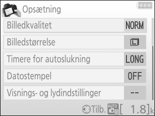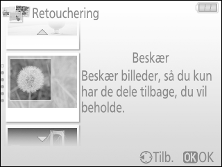 For at opnå adgang til disse menuer skal du markere Tag bill., Vis/slet, Retouchering eller Opsætning og trykke på J.