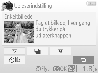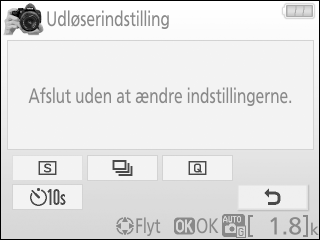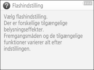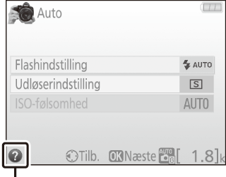 | Få vist Hjælp | Hvis ikonet d vises i nederste venstre hjørne af skærmen, kan du få vist Hjælp ved at trykke på knappen W (Q). Tryk på 1 eller 3 for at rulle gennem visningen, eller tryk på W (Q) igen for at afslutte.