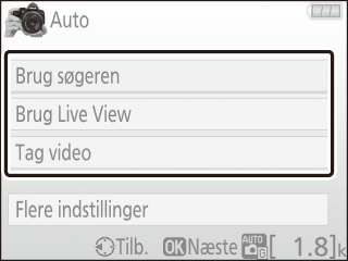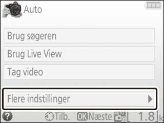 | Markere indstillinger | Tryk på 1 eller 3 for at markere indstillinger i menuerne. |