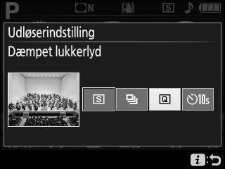 I indstillingen Dæmpet lukkerlyd klikker spejlet ikke tilbage på plads, mens udløserknappen trykkes helt ned, hvilket gør det muligt for fotografen at styre timingen af spejlets kliklyd, som også er mere stille end i enkeltbilledindstilling. Desuden lyder bippet ikke uanset indstillingen valgt for Bip-indstillingen i opsætningsmenuen.