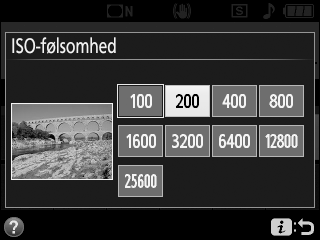 Kameraets følsomhed overfor lys kan justeres i henhold til mængden af det tilgængelige lys. Jo højere ISO-følsomhed, jo mindre lys kræves der for at lave en eksponering, der tillader høje lukkertider eller mindre blænder. Valg af Auto giver kameraet mulighed for automatisk at indstille ISO-følsomheden i forhold til lysforholdene; for at anvende auto i indstillingerne P, S, A og M skal du vælge Auto ISO-følsomhedsstyring for punktet ISO-følsomhedsindstillinger i optagemenuen (0 Auto -ISO-følsomhedsstyring).