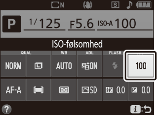 Få vist indstillinger for ISO-følsomhed. Tryk på knappen P, markér derefter den aktuelle ISO-følsomhedsindstilling i informationsvisningen, og tryk på J.  Knappen P