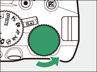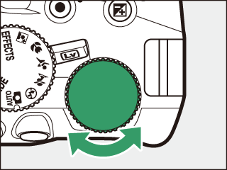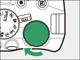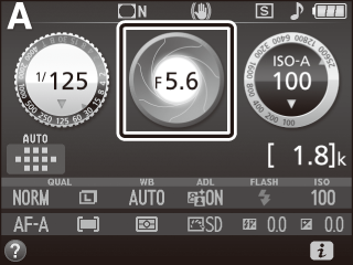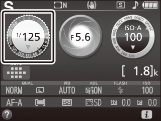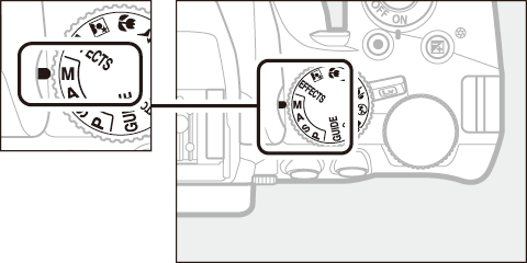 Vælg blændeåbning og lukkertid. Under kontrol af eksponeringsindikatoren (se nedenfor) skal du justere lukkertid og blændeåbning. Lukkertiden vælges ved at dreje kommandohjulet (mod højre for korte lukkertider, mod venstre for længere lukkertider). For at justere blænden skal du holde knappen E (N) nede, mens du drejer kommandohjulet (mod venstre for store blænder/lave blændeværdier og mod højre for små blænder/høje blændeværdier). Lukkertid  Kommandohjul   Blænde  Knappen E (N)  Kommandohjul