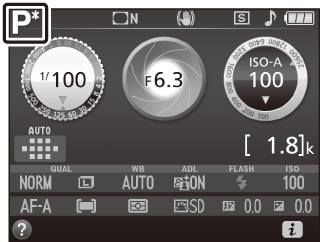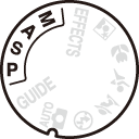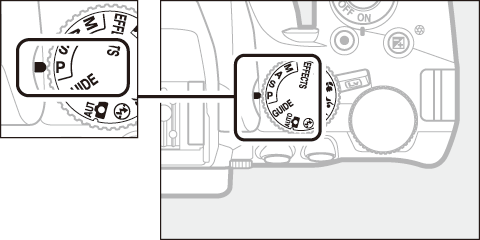 | P | Programautomatik (0 Indstilling P (programautomatik)): Anbefales til snapshots og andre situationer, hvor der ikke er ret meget tid til at justere kameraindstillingerne. Kameraet indstiller lukkertid og blænde, så der opnås optimal eksponering. |