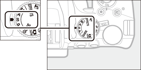 | A | Blændeprioriteret automatik (0 Indstilling A (blændeprioriteret automatik)): Anvendes til at sløre baggrunden eller bringe både for- og baggrund i fokus. Brugeren vælger blænde; kameraet vælger lukkertid, så der opnås det bedste resultat. |