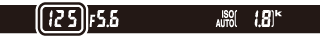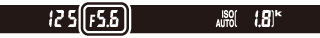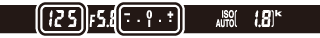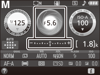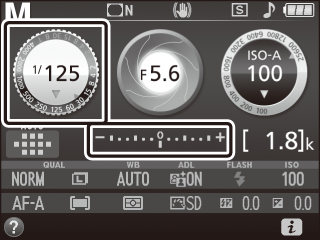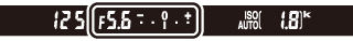 Hvis der er monteret et objektiv af typen E eller G (0 Kompatible CPU-objektiver), og der er valgt en anden lukkertid end "Bulb" eller "Langtidseksponering" (0 Langtidseksponeringer (kun indstilling M)), viser eksponeringsindikatoren i søgeren og informationsvisningen, hvorvidt billedet bliver under- eller overeksponeret ved de aktuelle indstillinger.