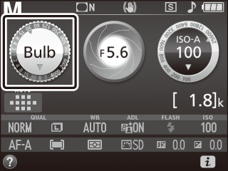 Vælg lukkertiden. Mens lysmålerne er aktive, skal du dreje kommandohjulet for at vælge lukkertiden Bulb (A).  Kommandohjul