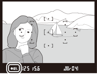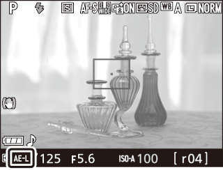Lås eksponeringen. Anbring motivet i det valgte fokuspunkt, og tryk udløserknappen halvt ned. Mens udløserknappen er trykket halvt ned, og motivet er placeret i fokuspunktet, skal du trykke på knappen A (L) for at låse eksponeringen. Udløserknap  Knappen A (L) Når eksponeringslåsen er aktiveret, vises indikatoren AE-L i søgeren og på skærmen.