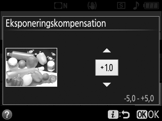 For at vælge en værdi for eksponeringskompensation skal du holde knappen E (N) nede og dreje kommandohjulet, indtil den ønskede værdi vises.