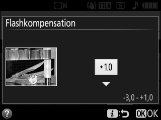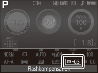 Flashkompensation anvendes for at ændre flashudladningen fra det niveau, der foreslås af kameraet, ved at ændre hovedmotivets lysstyrke i forhold til baggrunden. Flashudladningen kan forøges for at få hovedmotivet til at fremstå lysere eller reduceres for at undgå uønskede højlysområder eller refleksioner (0 Flashkompensation).