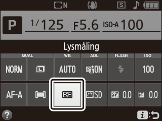 Få vist lysmålingsindstillingerne. Tryk på knappen P, markér derefter den aktuelle lysmålingsmetode i informationsvisningen, og tryk på J.  Knappen P
