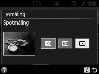 | N | Spotmåling | Vælg denne indstilling for at sikre, at motivet eksponeres korrekt, selv når baggrunden er meget lysere eller mørkere. Kameraet måler aktuelt fokuspunkt; anvendes til måling af motiver, der ikke er midt i billedet. |