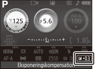 Du kan også få adgang til indstillingerne for eksponeringskompensation i informationsvisningen (0 Knappen P ).