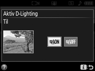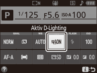 Få vist indstillinger for Aktiv D-Lighting. Tryk på knappen P, markér derefter Aktiv D-Lighting i informationsvisningen, og tryk på J.  Knappen P