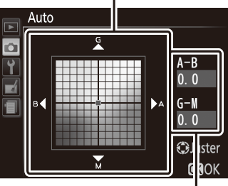 Finindstil hvidbalancen. Anvend multivælgeren til at finindstille hvidbalancen. Hvidbalance kan finindstilles på den gul (A)-blå (B) akse i trin på 0,5 og på den grøn (G)–lilla (M) akse i trin på 0,25. Den vandrette (gul-blå) akse svarer til farvetemperatur, mens den lodrette (grøn-lilla) akse har effekter, der ligner dem fra de tilsvarende farvekompensationsfiltre (CC-filtre). Den vandrette akse styres i trin svarende til omtrent 5 mired, og den lodrette akse styres i trin på 0,05 enheder for spredning af tæthed. Koordinater  Justering