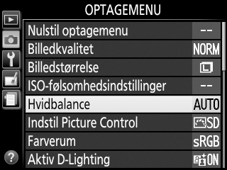 Hvidbalancen kan vælges ved hjælp af indstillingen Hvidbalance i optagemenuen (0 Hvidbalance), som også kan anvendes til at finindstille hvidbalance (0 Finindstilling af hvidbalance) eller måle en værdi for forudindstillet hvidbalance (0 Forudindstillet manuelt).