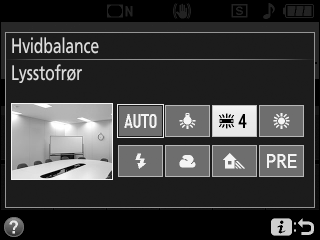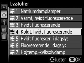Indstillingen I Lysstofrør i menuen Hvidbalance kan anvendes til at vælge lyskilden blandt bulb-typerne.