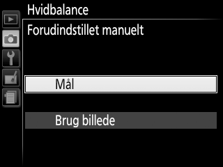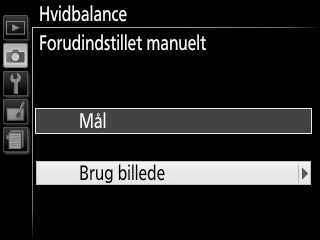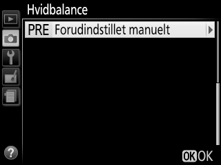 Få vist indstillinger for hvidbalance. Markér Hvidbalance i optagemenuen, og tryk på 2 for at få vist indstillingerne for hvidbalance. Markér L Forudindstillet manuelt, og tryk på 2.
