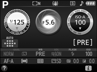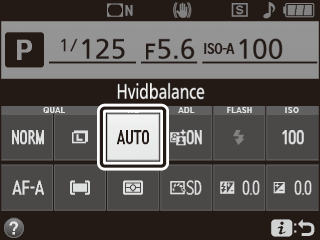 Få vist indstillinger for hvidbalance. Tryk på knappen P, markér derefter den aktuelle indstilling for hvidbalance i informationsvisningen, og tryk på J.  Knappen P