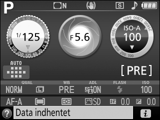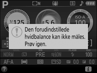 Kameraet kan kun gemme én værdi for forudindstillet hvidbalance ad gangen; den eksisterende værdi erstattes, når en ny værdi måles. Bemærk, at eksponeringen automatisk forøges med 1 EV ved målingen af hvidbalance; når der optages i indstilling M, skal du justere eksponeringen, så eksponeringsindikatoren viser ±0 (0 Eksponeringsindikatoren).