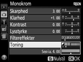 | Toning | Vælg det farveskær, der anvendes på monokrome billeder (0 Toning (kun Monokrom)). | |