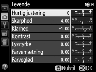 Justér indstillingerne. Tryk på 1 eller 3 for at markere den ønskede indstilling, og tryk på 4 eller 2 for at vælge en værdi i trin på 1, eller drej kommandohjulet for at vælge en værdi i trin på 0,25 (0 Picture Control-indstillinger; de tilgængelige indstillinger varierer med den valgte Picture Control). Gentag dette trin, indtil alle indstillinger er blevet justeret, eller vælg en forudindstillet kombination af indstillinger ved hjælp af multivælgeren for at vælge Hurtig justering og trykke på 4 eller 2. Du kan gendanne standardindstillingerne ved at trykke på knappen O.