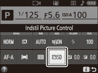 Få vist indstillingerne for Picture Control. Tryk på knappen P, markér derefter den aktuelle Picture Control, og tryk på J.  Knappen P