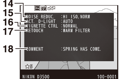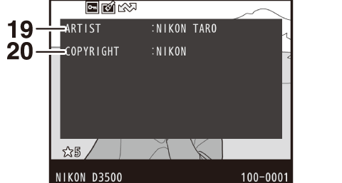 Copyrightoplysninger vises kun, hvis de er optaget med billedet ved hjælp af indstillingen Copyrightoplysninger i opsætningsmenuen.
