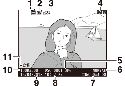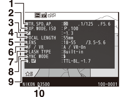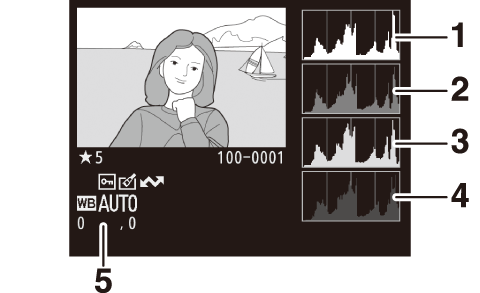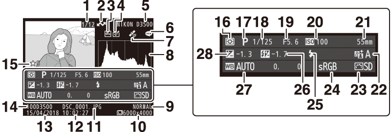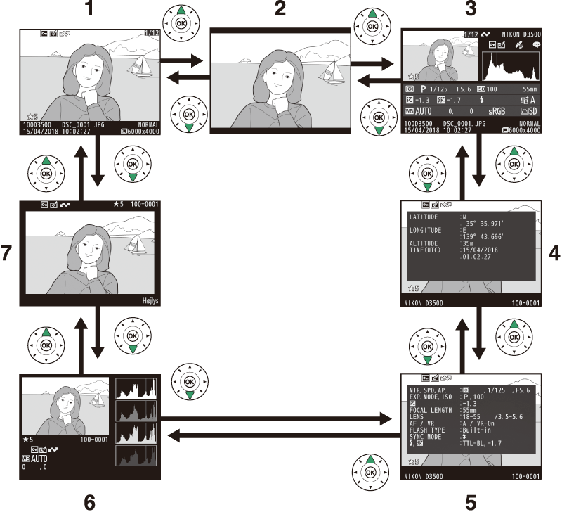 Der vises billedinformation på billederne, når de vises i fuldskærmsvisning. Tryk på 1 eller 3 for at bladre igennem billedinformationen som vist nedenfor. Bemærk, at "kun billede", optagedata, RGB-histogrammer, højlys og dataoversigt kun vises, hvis der er valgt en tilsvarende indstilling for Billedvisningsindstillinger (0 Billedvisningsindstillinger). Lokationsdata vises kun, hvis de er indlejret i billedet (0 Lokationsdata).