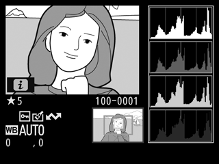 For at zoome ind på billedet ved visning af histogrammet skal du trykke på X. Anvend knapperne X og W (Q) for at zoome ind og ud, og rul gennem billedet med multivælgeren. Histogrammet opdateres for kun at vise den del af billedet, der kan ses på skærmen.