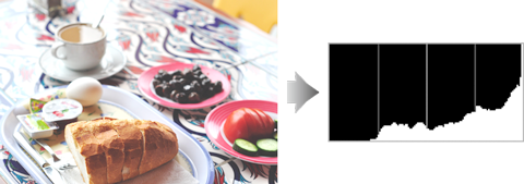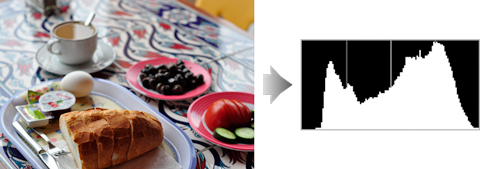 Hvis billedet indeholder genstande med et bredt udvalg af lysstyrker, bliver fordelingen af tonerne forholdsvis jævn.