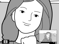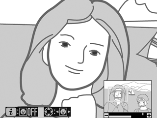Det aktuelle motiv indikeres af en hvid ramme i navigationsvinduet. Tryk på X eller W (Q) for at zoome ind eller ud eller anvende multivælgeren for at få vist andre ansigter.