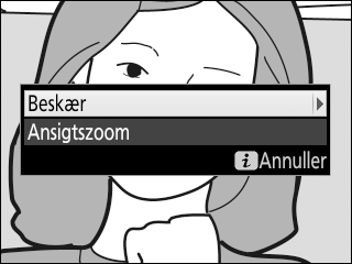 For at zoome ind på et ansigt registreret af kameraet skal du trykke på knappen P i zoomvisningen og derefter markere Ansigtszoom og trykke på J.