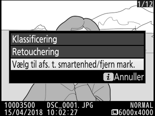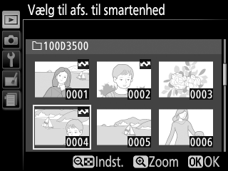 Vælg Vælg til afs. t. smartenhed/fjern mark. Markér Vælg til afs. t. smartenhed/fjern mark., og tryk på J. Billeder valgt til overførsel indikeres af ikonet & ; for at fravælge skal du få vist eller markere billedet og gentage trin 2 og 3.